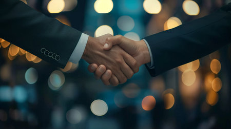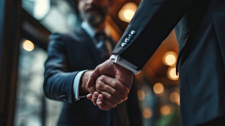 A detailed view of two individuals engaged in a handshake, symbolizing agreement or greeting.