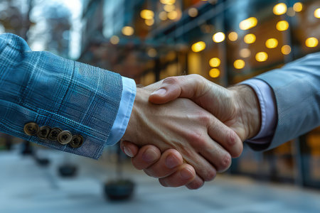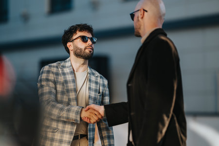 Businessmen shake hands outdoors in stylish plaid blazer, signaling partnership and professional collaboration