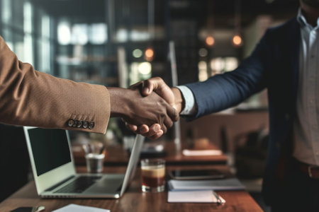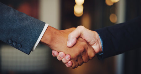 Close-up of two hands shaking in agreement during a business deal in a formal setting.