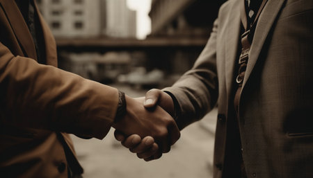 Close-up of a handshake between two business partners, symbolizing trust, partnership, and successful agreements. Ideal for themes of teamwork, business deals, and cooperation.