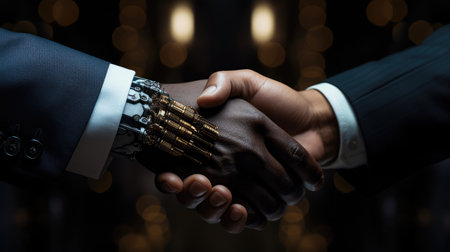 Powerful image of a handshake, The synergy of man and machine in the world of business and technology.