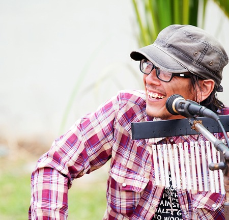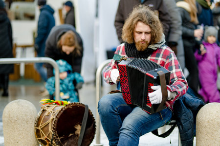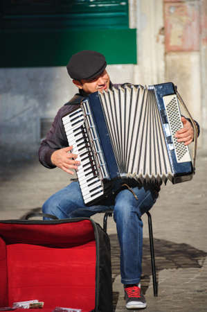 musician playing on accordion. street music is popular