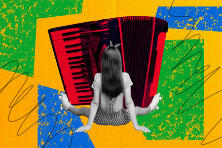 Art banner collage of girl sit back wear roller-skates activity music accordion instrument occasion disco