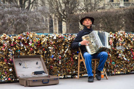Accordion player on the Pont de l'Archeveche Archbishop's Bridge at the Notre-Dame in Paris, France, on February 18, 2014