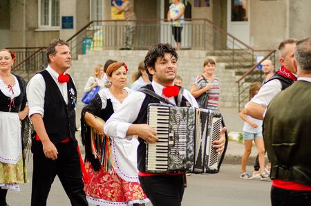 Slavuta, Ukraine - september 22, 2019 : Ukrainian man in national costume playing the accordion during the Ethno-eco festival Koledar in city Slavuta, Ukraine