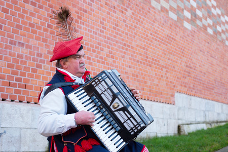 KRAKOW, POLAND - NOV 11, 2014: Street musician wore in traditional Poland dress playing on the street of Krakow.