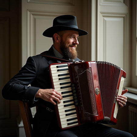 Portrait of a bearded man in a hat with an accordion