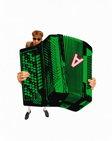 Poster. Contemporary art collage. Man enthusiastically playing oversized instrument, accordion with his huge hands. Concept of music and rhythm, hobby, festivals and concerts.