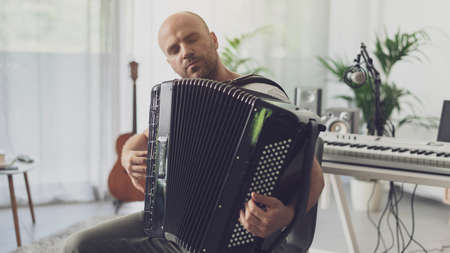Musician in his studio at home, he is playing the accordion, arts and creativity concept