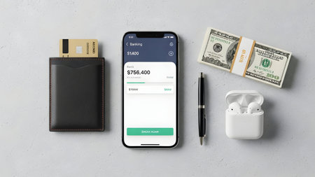 Smartphone screen mockup with credit card, wallet, pen and mobile phone