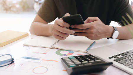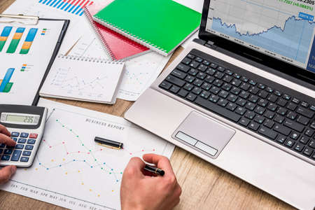 Administrator businessman making report, calculating balance. Business analyzing income charts, graphs and data on the table.