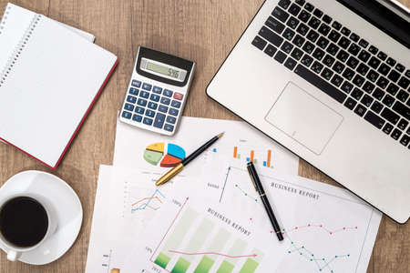 Top view of a business office desk workspace with laptop computer, calculator and a financial report paperwork.