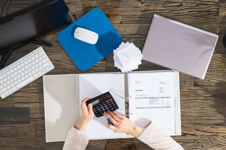Elevated View Of A Businesswoman Calculating Invoice At Workplace