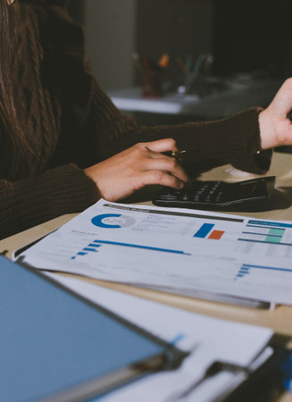 Business woman working in finance and accounting Analyze financial budget with calculator. work from home concept.