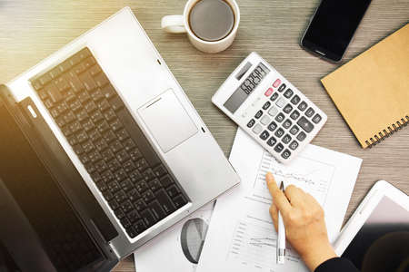businessman working on desk office with using a calculator to calculate the numbers, finance accounting concept
