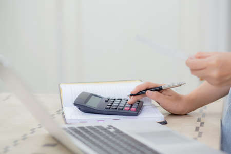 Closeup hands of woman calculating finance household with calculator on desk at home, girl checking bill for saving and planning expenses, debt and loan, tax and accounting, business and financial.