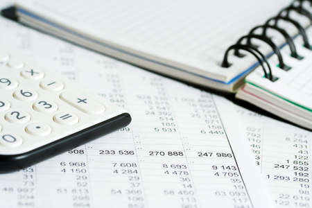 business office desk closeup - financial reports, analysis and accounting, set of documents, tables and graphs, various items for bookkeeping, calculator