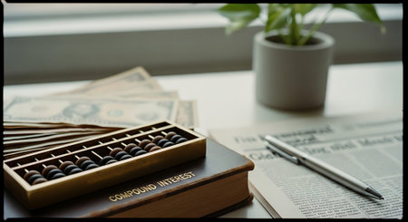 A wooden compound interest calculator on a desk with cash, a notebook, pen, and a potted plant by the window.