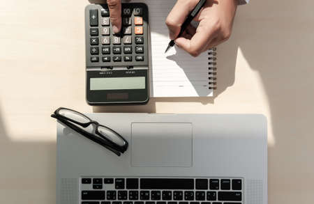 Close up Business woman using calculator for do math finance on wooden desk in office. tax, accounting, statistics and analytic research concept. top view.