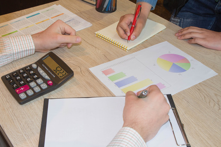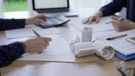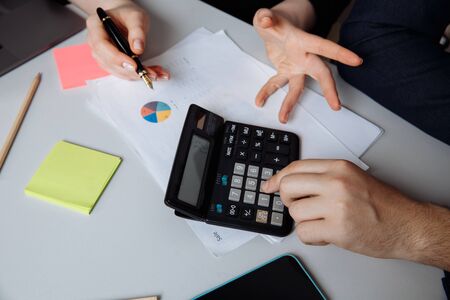 Close up view of businesspeople consulting on their project with paperwork and calculator