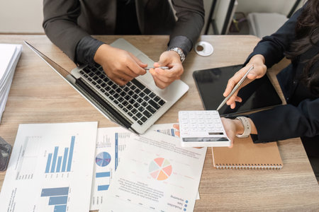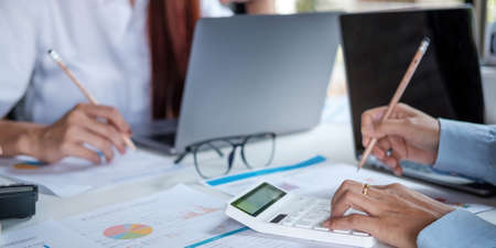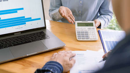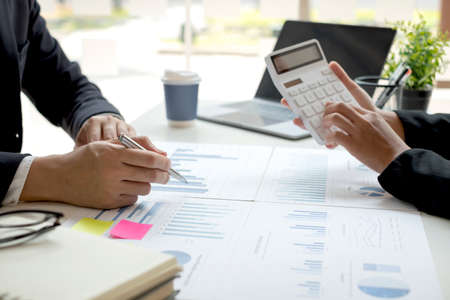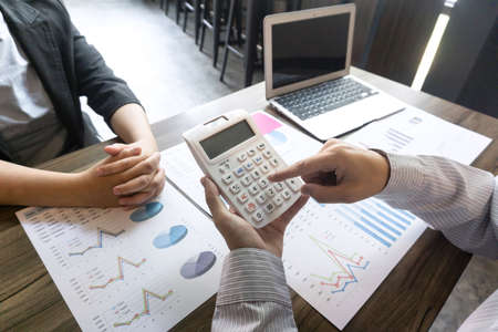 Business people using calculator and laptop computer for discussion about profit, tax, financial