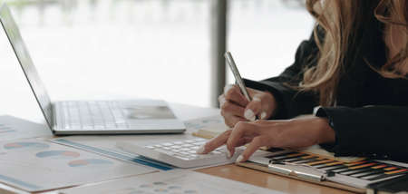 Close up Business woman hand using calculator to calculate the companys financial results and budget. Account Audit Concept.