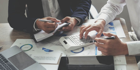 Business accountant or banker, business partner calculate and analysis with stock financial indices and financial costs wisely and carefully, investment and finance concept.