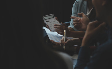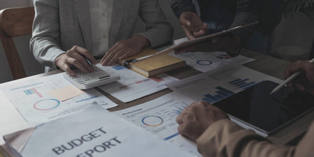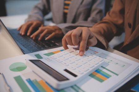 Close-up of diverse business professionals reviewing financial reports and using a calculator in an office.
