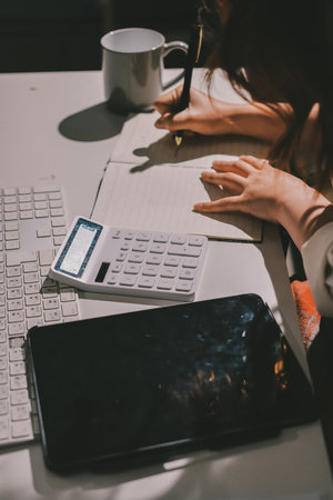Business woman working in finance and accounting Analyze financial budget with calculator. work from home concept.