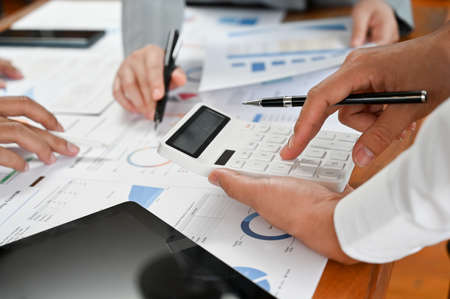 Investors working on desk office and using a calculator to calculate balance, projit, currency and cost. Accounting and Financial concept.