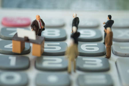 Closeup of miniature of businessmen discussing on big white calculator about interest rates or percentage changes