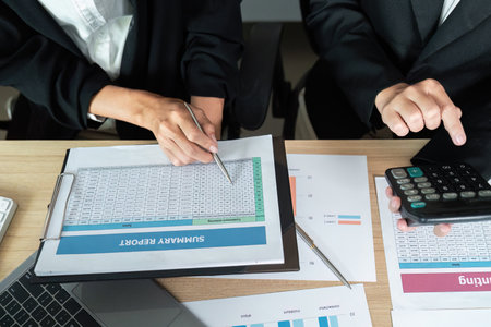 asian businessman or accountant working pointing graph discussion and analysis data charts and graphs and using a calculator to calculate numbers.Business finances and accounting concept