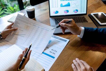 Businessmen are pointing numbers, graph, chart in business results. Business concept.