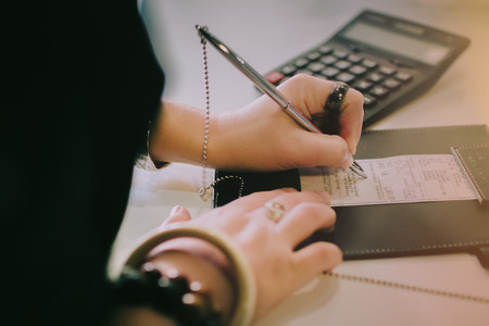 Man hand holding bill and pen with calculator expense or tax receipt. business finance concept.