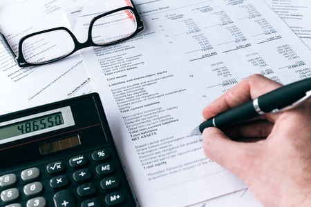Investors working on desk office and using a calculator to calculate balance, projit, currency and cost. Accounting and Financial concept.