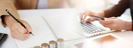 Woman hands sitting and holding credit card and using computer on table for online payment or shopping online. Businesswoman writing something on notebook with saving growth and stacking coin