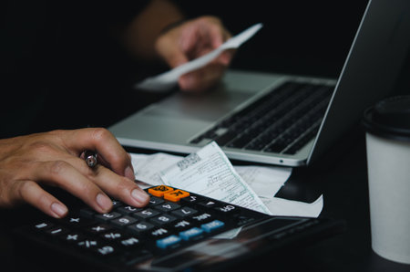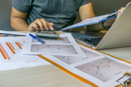 Close up Businessman using calculator and laptop for calaulating finance, tax, accounting, statistics and analytic research concept