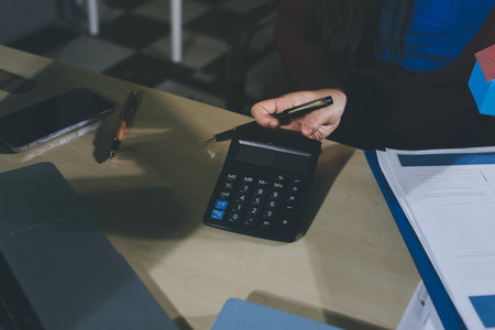 Close up Business woman using calculator for do math finance on wooden desk in office. tax, accounting, statistics and analytic research concept. top view.