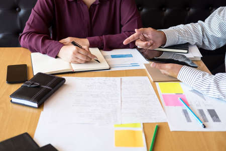 accountant pointing on laptop for meeting team in office room. concept finance and accounting