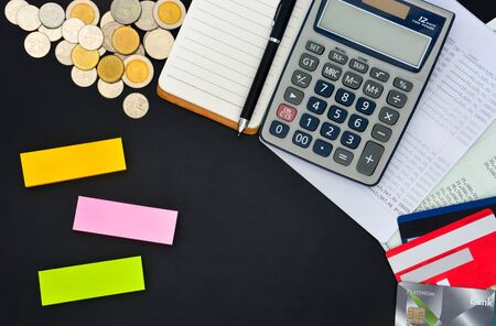 top view of credit cards, passbooks saving account, calculator, notebook with pen, pile of coins and colorful sticky notes on black background, copy space, personal financial planning concept