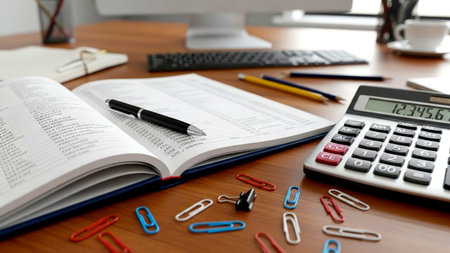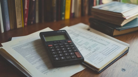 Calculator, bank ledger, and stack of financial documents on clean business table
