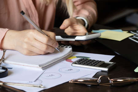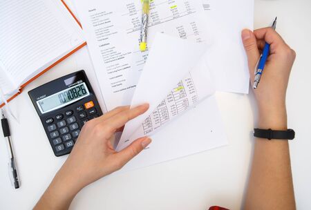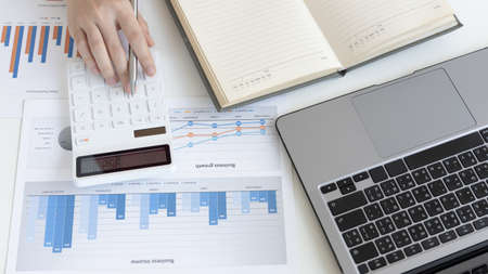 Business woman working in finance and accounting Analyze financial budget with calculator. work from home concept.