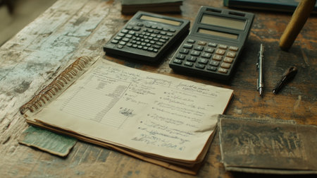 A cozy vintage workspace featuring a notepad, two calculators, and pens on a rustic wooden table, ideal for capturing moments of organization and productivity in finance.