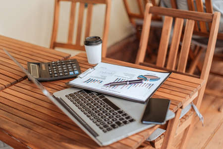 On the home table are stock and finance charts with a calculator, a coffee mug, a pencil, a marker pen, two notebooks, a smartphone and a tablet for remote work. Work at home.