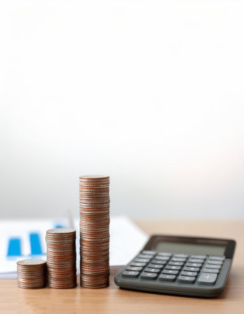 Stack of coins on wooden table with calculator and financial graph nearby. White background to isolate objects. Simple and clean