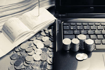 Businessman put coin stack money and many bank note in office.Business investment accounting finance Save money for future and Retirement.