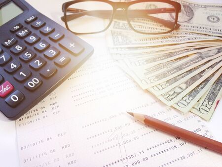 Business, finance, investment or accounting concept : Dollar money, calculator and saving account book or financial statement on office table