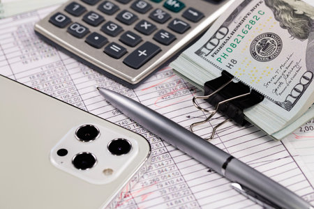 100 US dollars bills fan and calculator with glasses and pen. Business loan or tax payment season concept. Financial planning
