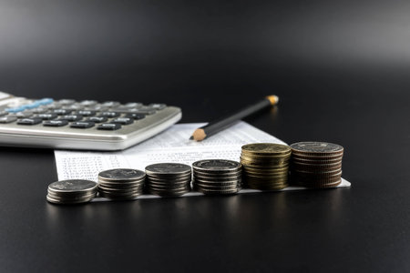 Stacks of Coin and and calculator on Banking Account for Business Finance Concept on Black Background , Selective Focus.