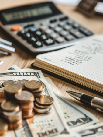 A stack of cash and coins beside an open notebook filled with financial notes and calculations, all arranged on a wooden desk.